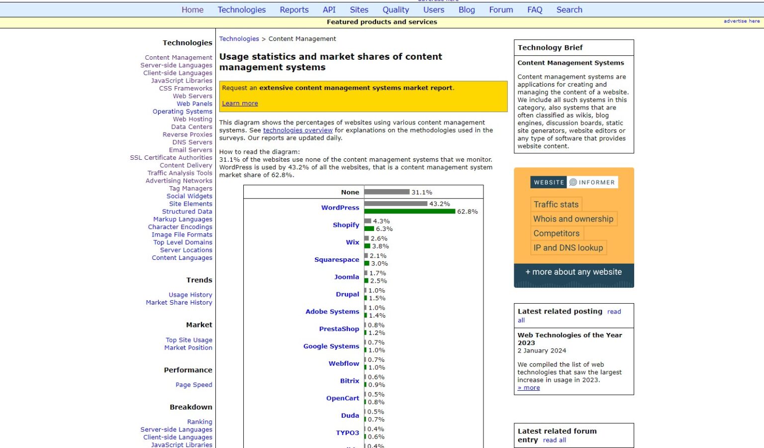 W3Techs stellt Informationen über die Nutzung verschiedener Arten von Technologien im Web bereit.